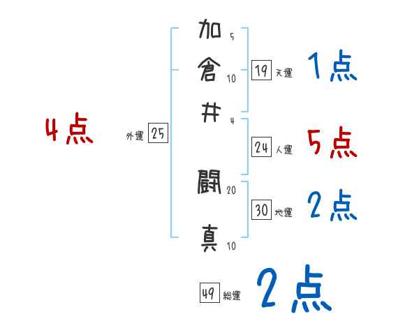 総運![]() | 加倉井闘真さんの総運は49画の2つ星!不安定な性格で明暗がある人生。周りの人には支援されやすい。 あなたの人生を表す1番重要な運勢です。生涯を通じて影響する総合運となり、主に50歳以降の晩年期に影響を及ぼします。 |