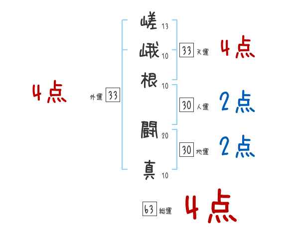 天運![]() | 嵯峨根闘真さんの天運は33画の4つ星!権力志向でプライドが高い。勇気があり運を切り開き成功する。 家系が持つ宿命的な運勢を表します。祖先から受け継いだ苗字ですので自分の力が及びません。家柄を象徴します。 |