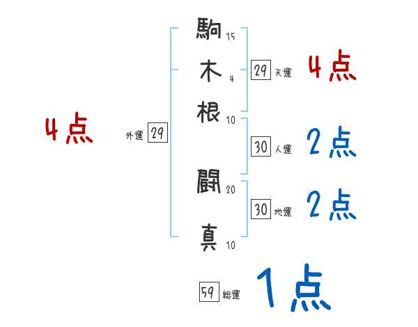 総運![]() | 駒木根闘真さんの総運は59画の1つ星!意志の弱さであきらめることが多いかも。粘り強さが必要。 あなたの人生を表す1番重要な運勢です。生涯を通じて影響する総合運となり、主に50歳以降の晩年期に影響を及ぼします。 |