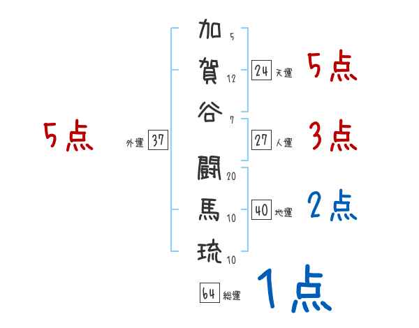 天運![]() | 加賀谷闘馬琉さんの天運は24画の5つ星!家庭運が良く順調な人生。金運にも恵まれる。 家系が持つ宿命的な運勢を表します。祖先から受け継いだ苗字ですので自分の力が及びません。家柄を象徴します。 |