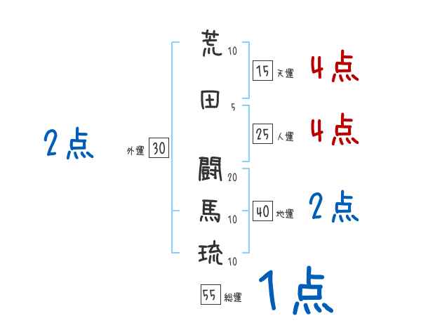 天運![]() | 荒田闘馬琉さんの天運は15画の4つ星!人徳があり出世する。順調に物事を進め円満な人生。 家系が持つ宿命的な運勢を表します。祖先から受け継いだ苗字ですので自分の力が及びません。家柄を象徴します。 |
