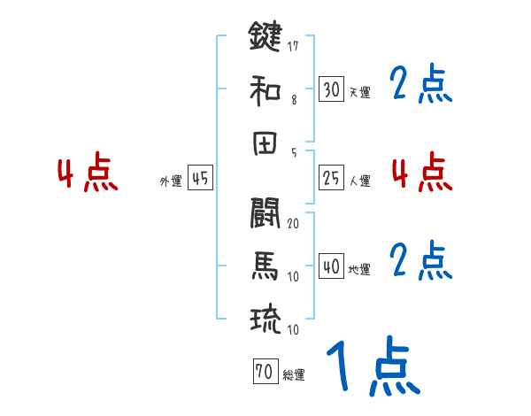 総運![]() | 鍵和田闘馬琉さんの総運は70画の1つ星!恵まれず苦境に立たされることも。自滅しないように周りの助けを借りましょう。 あなたの人生を表す1番重要な運勢です。生涯を通じて影響する総合運となり、主に50歳以降の晩年期に影響を及ぼします。 |