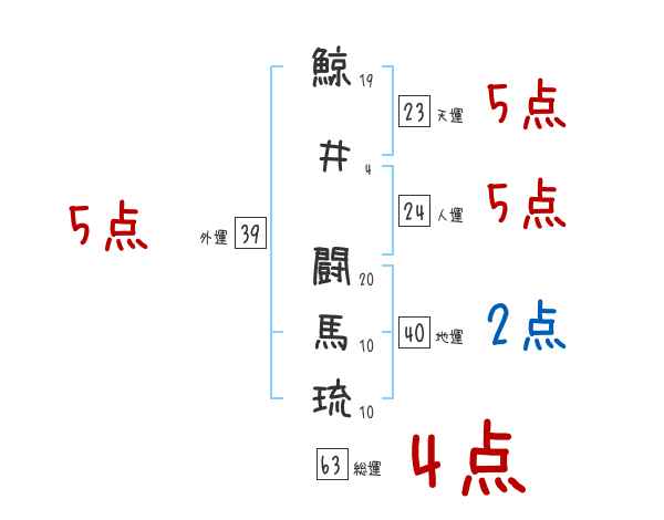 外運![]() | 鯨井闘馬琉さんの外運は39画の5つ星!社交性に優れ人望が厚い。人の上に立ち成功する。 生活面を象徴する運勢です。外部から受ける影響力を表し、結婚運、家庭運や職場、環境への順応性を表します。 |