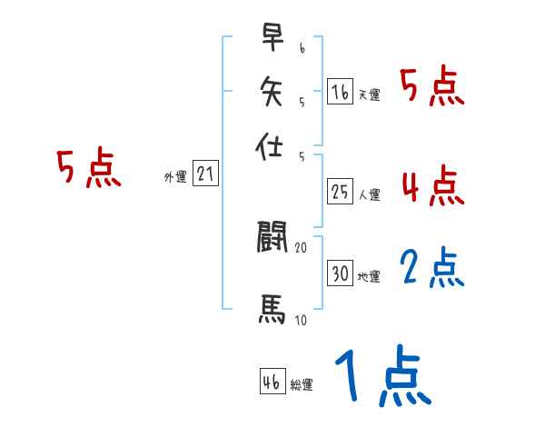 天運![]() | 早矢仕闘馬さんの天運は16画の5つ星!人望が厚く大きく発展する。逆転成功が見える。 家系が持つ宿命的な運勢を表します。祖先から受け継いだ苗字ですので自分の力が及びません。家柄を象徴します。 |
