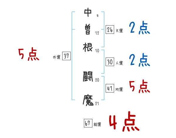 外運![]() | 中曽根闘魔さんの外運は37画の5つ星!努力家で順応性に優れる。現実的な考え方ができ忠実に物事をこなす。 生活面を象徴する運勢です。外部から受ける影響力を表し、結婚運、家庭運や職場、環境への順応性を表します。 |