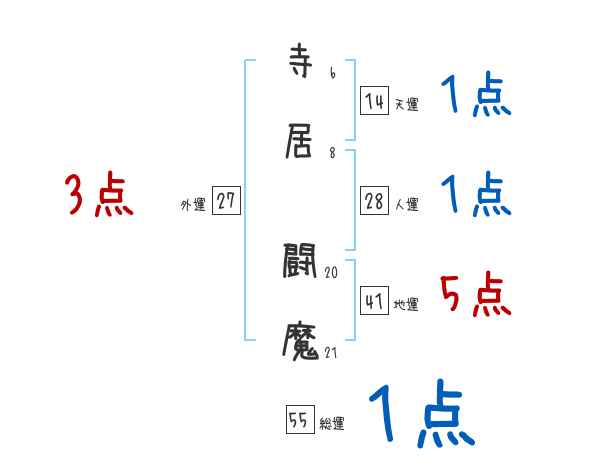 天運![]() | 寺居闘魔さんの天運は14画の1つ星!人に対して優しいがストレスを溜め込みがち。人間関係のトラブルを避けるよう気をつけましょう。 家系が持つ宿命的な運勢を表します。祖先から受け継いだ苗字ですので自分の力が及びません。家柄を象徴します。 |