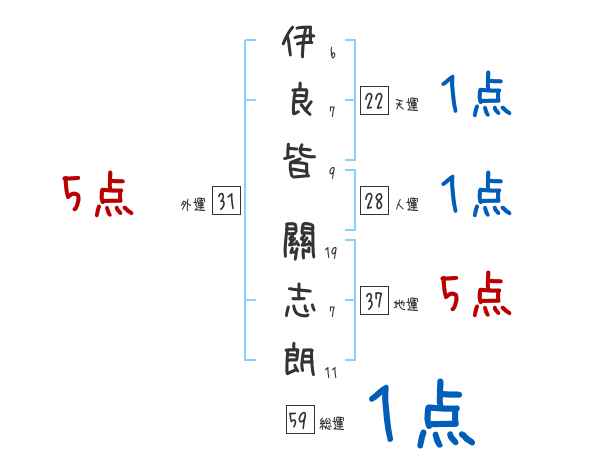 総運![]() | 伊良皆關志朗さんの総運は59画の1つ星!意志の弱さであきらめることが多いかも。粘り強さが必要。 あなたの人生を表す1番重要な運勢です。生涯を通じて影響する総合運となり、主に50歳以降の晩年期に影響を及ぼします。 |