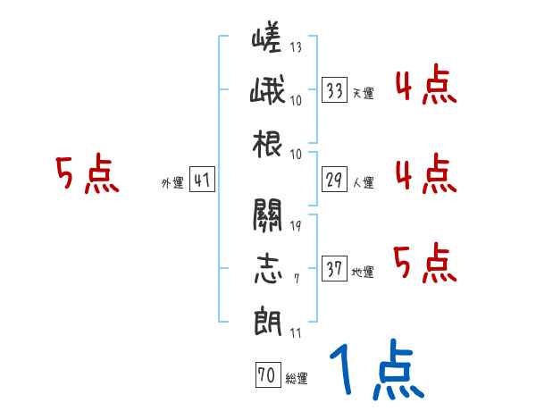 地運![]() | 嵯峨根關志朗さんの地運は37画の5つ星!努力家で順応性に優れる。現実的な考え方ができ忠実に物事をこなす。 個性を表す基礎的な運勢です。性格形成や対人関係、行動力など家庭環境に影響されます。主に誕生してから20歳くらいまでの若年期の運勢を表します。 |
