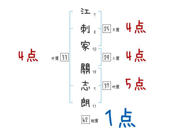 天運![]() | 江刺家關志朗さんの天運は25画の4つ星!個性があり才能があふれる。強運の持ち主で発展する。 家系が持つ宿命的な運勢を表します。祖先から受け継いだ苗字ですので自分の力が及びません。家柄を象徴します。 |