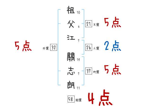天運![]() | 祖父江關志朗さんの天運は21画の5つ星!統率力がある。独立し成功する。名誉を手に入れる。 家系が持つ宿命的な運勢を表します。祖先から受け継いだ苗字ですので自分の力が及びません。家柄を象徴します。 |