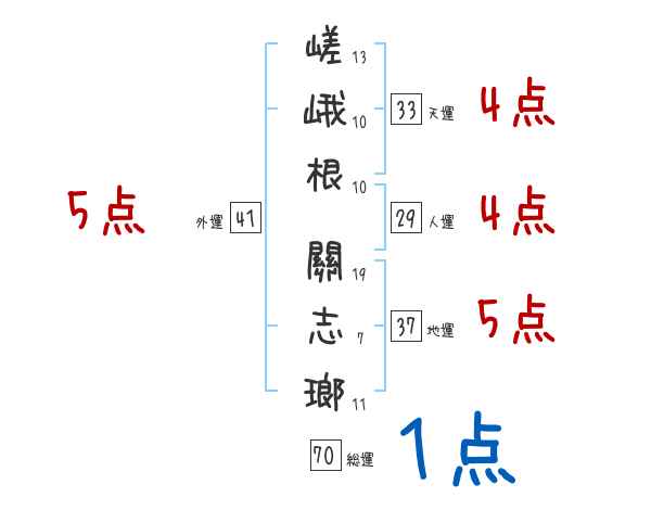 天運![]() | 嵯峨根關志瑯さんの天運は33画の4つ星!権力志向でプライドが高い。勇気があり運を切り開き成功する。 家系が持つ宿命的な運勢を表します。祖先から受け継いだ苗字ですので自分の力が及びません。家柄を象徴します。 |