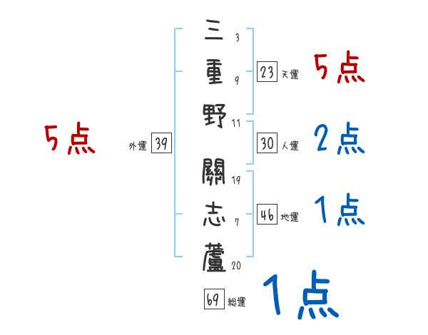 天運![]() | 三重野關志蘆さんの天運は23画の5つ星!想像力に優れ活力がある。一代で成功し名誉を手に入れる。 家系が持つ宿命的な運勢を表します。祖先から受け継いだ苗字ですので自分の力が及びません。家柄を象徴します。 |