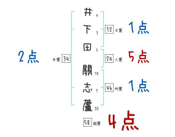 総運![]() | 井下田關志蘆さんの総運は58画の4つ星!安定した生活。大器晩成タイプ。 あなたの人生を表す1番重要な運勢です。生涯を通じて影響する総合運となり、主に50歳以降の晩年期に影響を及ぼします。 |