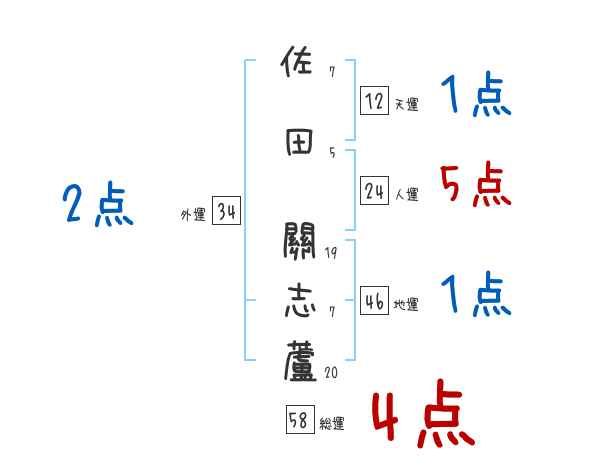 | 外運  | 佐田關志蘆さんの外運は34画の2つ星!独創性に優れるが、自尊心が強く災難に注意しましょう。生活面を象徴する運勢です。外部から受ける影響力を表し、結婚運、家庭運や職場、環境への順応性を表します。 |