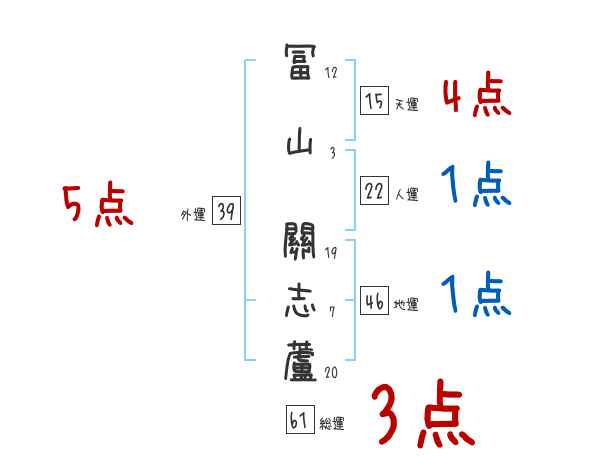 外運![]() | 冨山關志蘆さんの外運は39画の5つ星!社交性に優れ人望が厚い。人の上に立ち成功する。 生活面を象徴する運勢です。外部から受ける影響力を表し、結婚運、家庭運や職場、環境への順応性を表します。 |