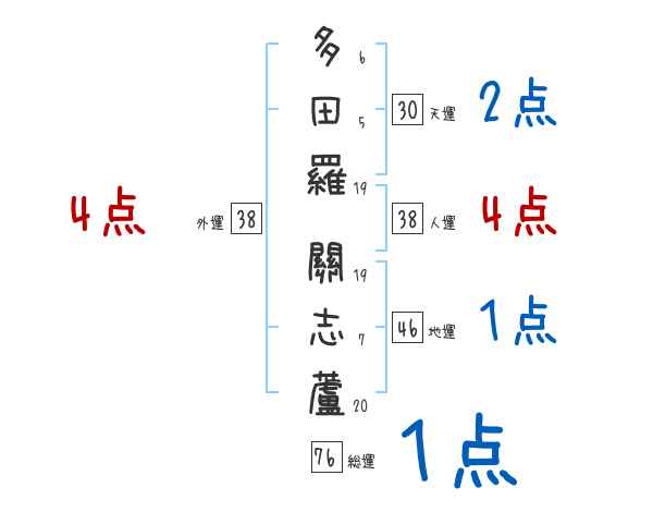 総運![]() | 多田羅關志蘆さんの総運は76画の1つ星!離散に注意。劣等感を感じ孤立しやすい傾向があるかも。 あなたの人生を表す1番重要な運勢です。生涯を通じて影響する総合運となり、主に50歳以降の晩年期に影響を及ぼします。 |