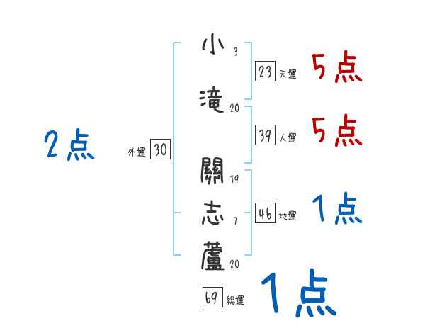 天運![]() | 小滝關志蘆さんの天運は23画の5つ星!想像力に優れ活力がある。一代で成功し名誉を手に入れる。 家系が持つ宿命的な運勢を表します。祖先から受け継いだ苗字ですので自分の力が及びません。家柄を象徴します。 |