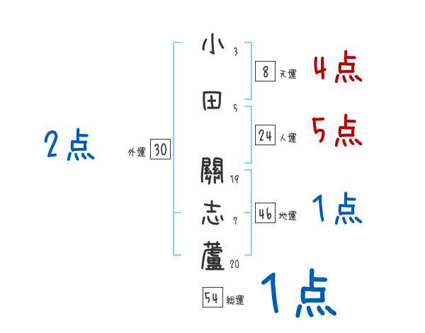 人運![]()  | 小田關志蘆さんの人運は24画の5つ星!家庭運が良く順調な人生。金運にも恵まれる。 性格や才能などを表す2番目に重要な運勢です。人間関係や協調性、社会的な成功に影響します。主に20歳から50歳ぐらいまでの中年期の運勢を表します。 |