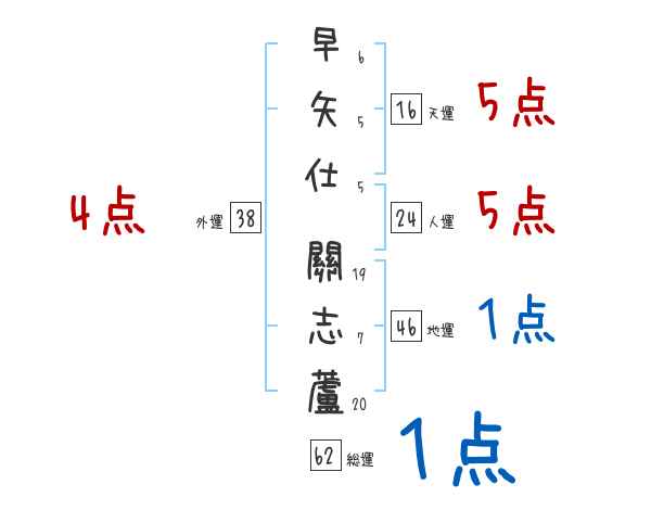 天運![]() | 早矢仕關志蘆さんの天運は16画の5つ星!人望が厚く大きく発展する。逆転成功が見える。 家系が持つ宿命的な運勢を表します。祖先から受け継いだ苗字ですので自分の力が及びません。家柄を象徴します。 |