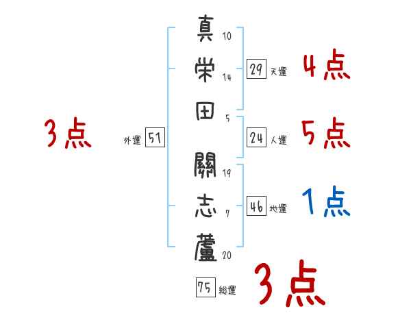 人運![]() | 真栄田關志蘆さんの人運は24画の5つ星!家庭運が良く順調な人生。金運にも恵まれる。 性格や才能などを表す2番目に重要な運勢です。人間関係や協調性、社会的な成功に影響します。主に20歳から50歳ぐらいまでの中年期の運勢を表します。 |