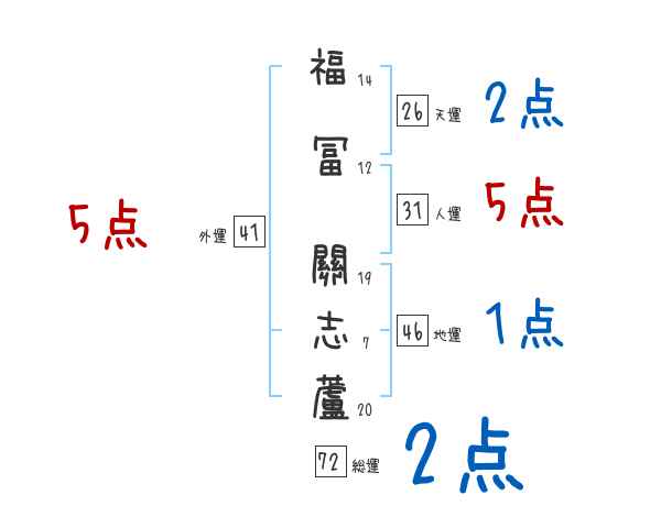 総運![]() | 福冨關志蘆さんの総運は72画の2つ星!災難が多く不安定な生活にならないように注意。明暗のある人生かも。 あなたの人生を表す1番重要な運勢です。生涯を通じて影響する総合運となり、主に50歳以降の晩年期に影響を及ぼします。 |