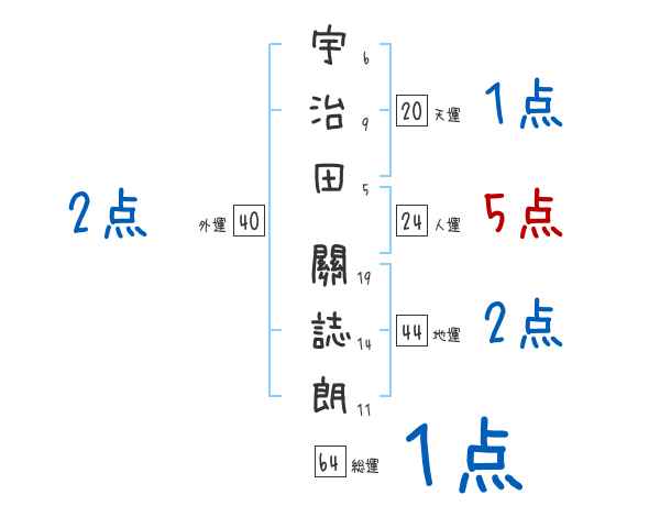 人運![]() | 宇治田關誌朗さんの人運は24画の5つ星!家庭運が良く順調な人生。金運にも恵まれる。 性格や才能などを表す2番目に重要な運勢です。人間関係や協調性、社会的な成功に影響します。主に20歳から50歳ぐらいまでの中年期の運勢を表します。 |
