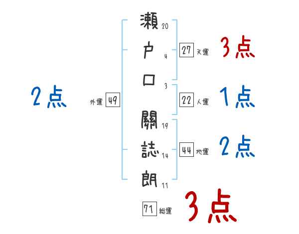 総運![]() | 瀬戸口關誌朗さんの総運は71画の3つ星!力が弱く小心者だが、いずれ安泰を手に入れる。 あなたの人生を表す1番重要な運勢です。生涯を通じて影響する総合運となり、主に50歳以降の晩年期に影響を及ぼします。 |