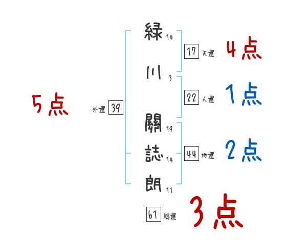 外運![]() | 緑川關誌朗さんの外運は39画の5つ星!社交性に優れ人望が厚い。人の上に立ち成功する。 生活面を象徴する運勢です。外部から受ける影響力を表し、結婚運、家庭運や職場、環境への順応性を表します。 |
