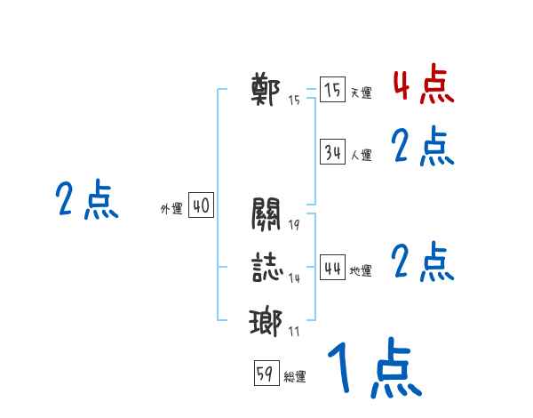 外運![]() | 鄭關誌瑯さんの外運は40画の2つ星!自信過剰で物事に固執するためトラブルに注意。 生活面を象徴する運勢です。外部から受ける影響力を表し、結婚運、家庭運や職場、環境への順応性を表します。 |