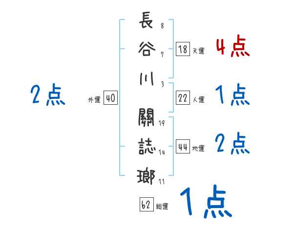 天運![]() | 長谷川關誌瑯さんの天運は18画の4つ星!情熱的で剛気。忍耐力があり信頼される。 家系が持つ宿命的な運勢を表します。祖先から受け継いだ苗字ですので自分の力が及びません。家柄を象徴します。 |