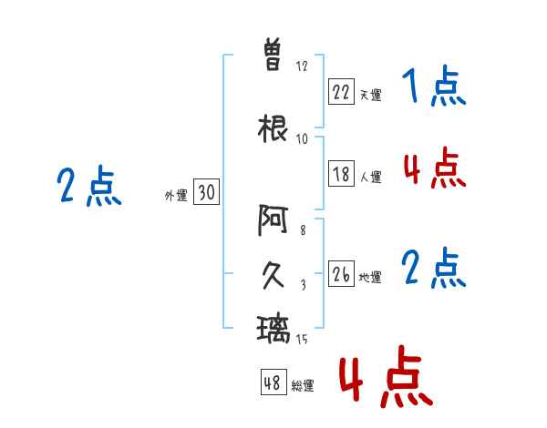 天運![]() | 曽根阿久璃さんの天運は22画の1つ星!努力することが苦手ないっぽう手先が器用。芸術性にも優れる。 家系が持つ宿命的な運勢を表します。祖先から受け継いだ苗字ですので自分の力が及びません。家柄を象徴します。 |