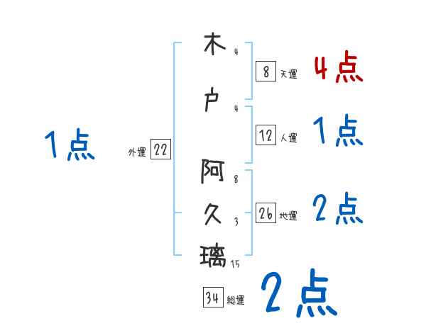 総運![]() | 木戸阿久璃さんの総運は34画の2つ星!独創性に優れるが、自尊心が強く災難に注意しましょう。 あなたの人生を表す1番重要な運勢です。生涯を通じて影響する総合運となり、主に50歳以降の晩年期に影響を及ぼします。 |
