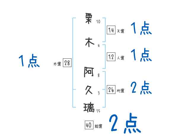 天運![]() | 栗木阿久璃さんの天運は14画の1つ星!人に対して優しいがストレスを溜め込みがち。人間関係のトラブルを避けるよう気をつけましょう。 家系が持つ宿命的な運勢を表します。祖先から受け継いだ苗字ですので自分の力が及びません。家柄を象徴します。 |