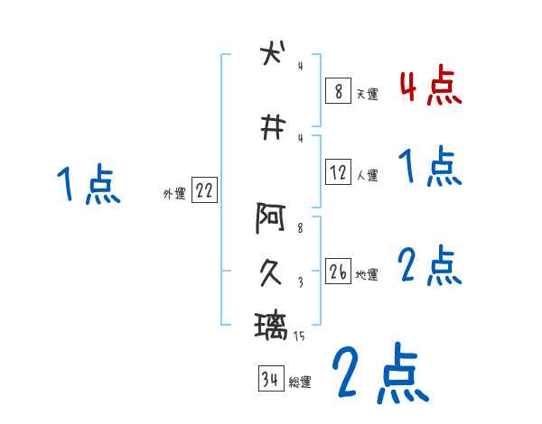 総運![]() | 犬井阿久璃さんの総運は34画の2つ星!独創性に優れるが、自尊心が強く災難に注意しましょう。 あなたの人生を表す1番重要な運勢です。生涯を通じて影響する総合運となり、主に50歳以降の晩年期に影響を及ぼします。 |