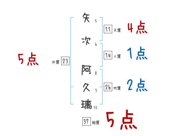 天運![]() | 矢次阿久璃さんの天運は11画の4つ星!着実に富や地位を得る幸運な人生。 家系が持つ宿命的な運勢を表します。祖先から受け継いだ苗字ですので自分の力が及びません。家柄を象徴します。 |