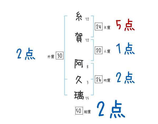 天運![]() | 糸賀阿久璃さんの天運は24画の5つ星!家庭運が良く順調な人生。金運にも恵まれる。 家系が持つ宿命的な運勢を表します。祖先から受け継いだ苗字ですので自分の力が及びません。家柄を象徴します。 |