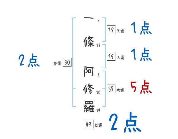 天運![]() | 一條阿修羅さんの天運は12画の1つ星!簡単な失敗で諦めてしまいやすいかも。着実に行動すると良いでしょう。 家系が持つ宿命的な運勢を表します。祖先から受け継いだ苗字ですので自分の力が及びません。家柄を象徴します。 |