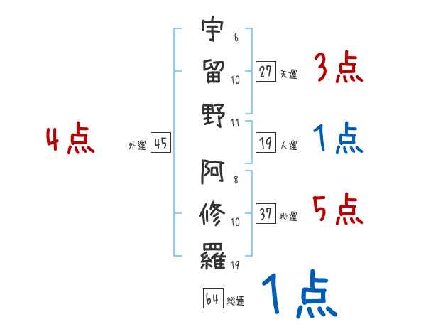 人運![]() | 宇留野阿修羅さんの人運は19画の1つ星!優れた才能を持ちますが、協調性が足りないことも。周りの人と協力する事を意識しましょう。 性格や才能などを表す2番目に重要な運勢です。人間関係や協調性、社会的な成功に影響します。主に20歳から50歳ぐらいまでの中年期の運勢を表します。 |