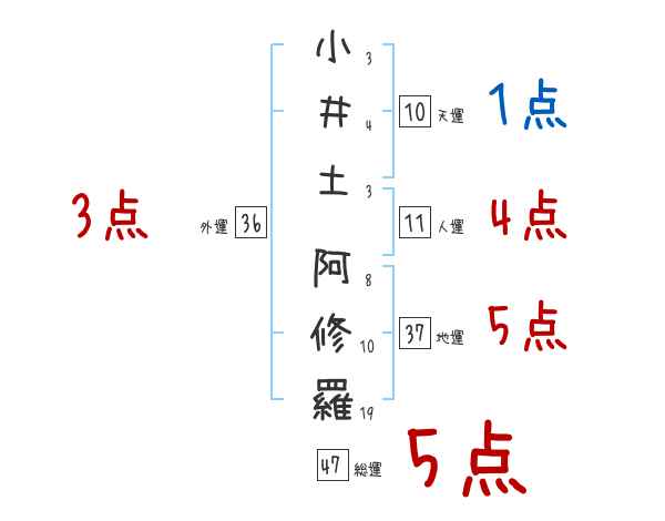 天運![]() | 小井土阿修羅さんの天運は10画の1つ星!不安を感じやすい傾向。ストレスを抱えないように注意しましょう。 家系が持つ宿命的な運勢を表します。祖先から受け継いだ苗字ですので自分の力が及びません。家柄を象徴します。 |