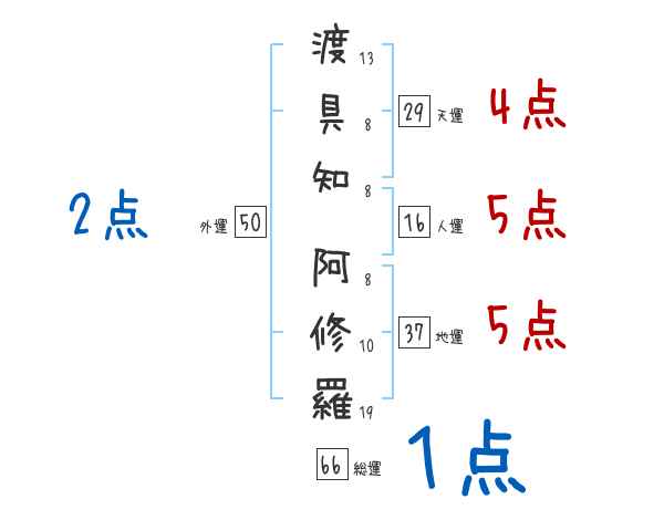 外運![]() | 渡具知阿修羅さんの外運は50画の2つ星!浮き沈みが激しく不安定。しりすぼみに衰退しやすいので注意しましょう。 生活面を象徴する運勢です。外部から受ける影響力を表し、結婚運、家庭運や職場、環境への順応性を表します。 |