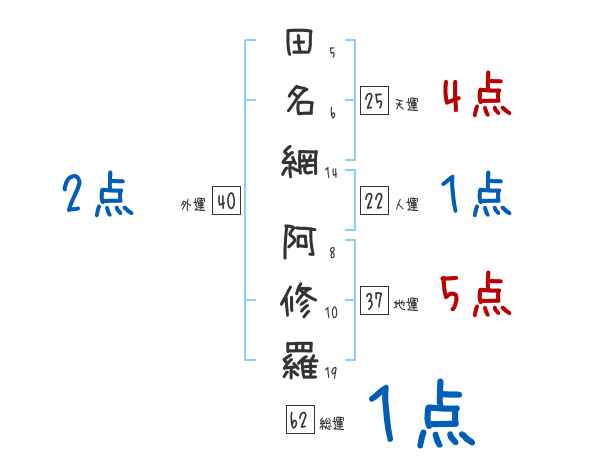 天運![]() | 田名網阿修羅さんの天運は25画の4つ星!個性があり才能があふれる。強運の持ち主で発展する。 家系が持つ宿命的な運勢を表します。祖先から受け継いだ苗字ですので自分の力が及びません。家柄を象徴します。 |