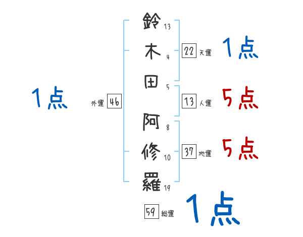 人運![]() | 鈴木田阿修羅さんの人運は13画の5つ星!才能に恵まれ人気がある。名声を手に入れる。円満な人生。 性格や才能などを表す2番目に重要な運勢です。人間関係や協調性、社会的な成功に影響します。主に20歳から50歳ぐらいまでの中年期の運勢を表します。 |