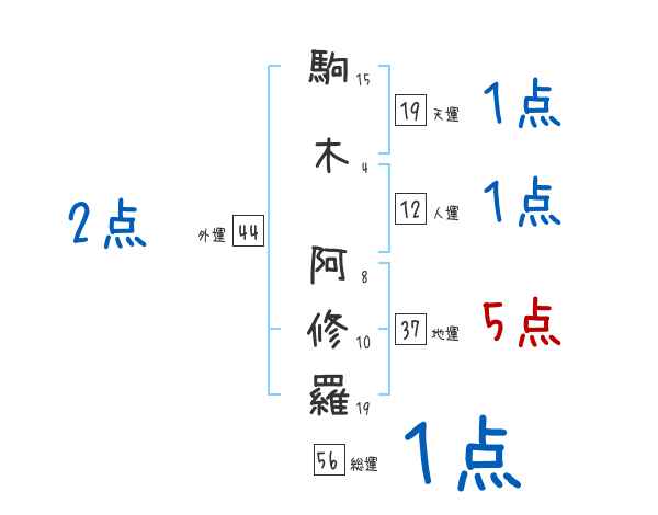天運![]() | 駒木阿修羅さんの天運は19画の1つ星!優れた才能を持ちますが、協調性が足りないことも。周りの人と協力する事を意識しましょう。 家系が持つ宿命的な運勢を表します。祖先から受け継いだ苗字ですので自分の力が及びません。家柄を象徴します。 |