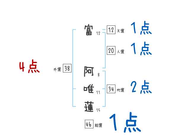 外運![]() | 富阿唯蓮さんの外運は38画の4つ星!温厚な性格で技術的な才能を発揮する。職人的な仕事に向いている。 生活面を象徴する運勢です。外部から受ける影響力を表し、結婚運、家庭運や職場、環境への順応性を表します。 |