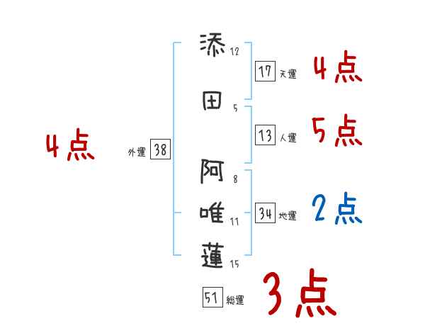 外運![]() | 添田阿唯蓮さんの外運は38画の4つ星!温厚な性格で技術的な才能を発揮する。職人的な仕事に向いている。 生活面を象徴する運勢です。外部から受ける影響力を表し、結婚運、家庭運や職場、環境への順応性を表します。 |