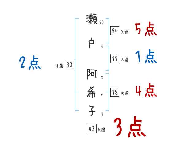 総運![]() | 瀬戸阿希子さんの総運は42画の3つ星!病気に注意。多芸であるが消極的でおとなしい。 あなたの人生を表す1番重要な運勢です。生涯を通じて影響する総合運となり、主に50歳以降の晩年期に影響を及ぼします。 |
