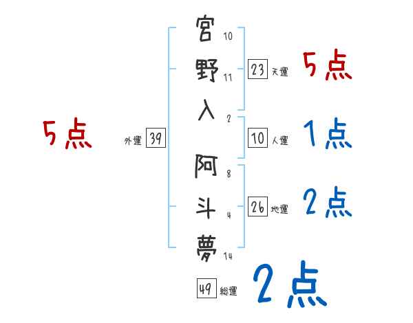 外運![]() | 宮野入阿斗夢さんの外運は39画の5つ星!社交性に優れ人望が厚い。人の上に立ち成功する。 生活面を象徴する運勢です。外部から受ける影響力を表し、結婚運、家庭運や職場、環境への順応性を表します。 |