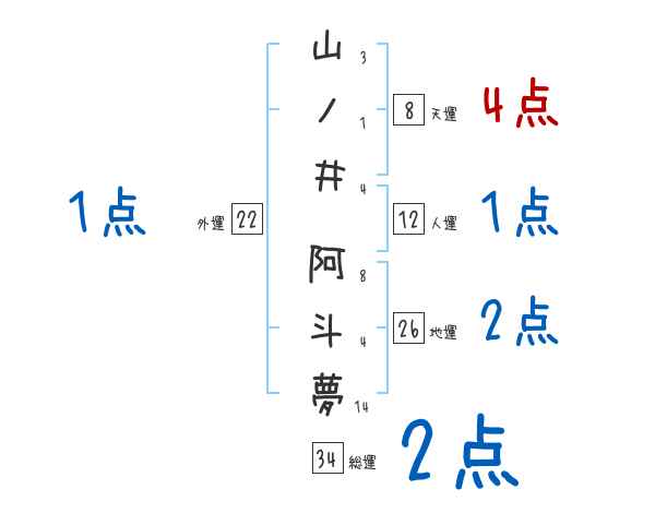 総運![]() | 山ノ井阿斗夢さんの総運は34画の2つ星!独創性に優れるが、自尊心が強く災難に注意しましょう。 あなたの人生を表す1番重要な運勢です。生涯を通じて影響する総合運となり、主に50歳以降の晩年期に影響を及ぼします。 |