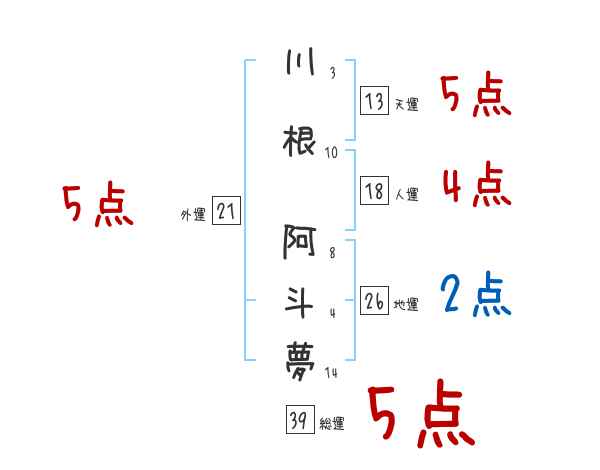 天運![]() | 川根阿斗夢さんの天運は13画の5つ星!才能に恵まれ人気がある。名声を手に入れる。円満な人生。 家系が持つ宿命的な運勢を表します。祖先から受け継いだ苗字ですので自分の力が及びません。家柄を象徴します。 |