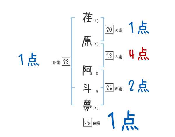 外運![]() | 荏原阿斗夢さんの外運は28画の1つ星!家庭環境に注意。スポーツで活躍できる能力があるかも。 生活面を象徴する運勢です。外部から受ける影響力を表し、結婚運、家庭運や職場、環境への順応性を表します。 |